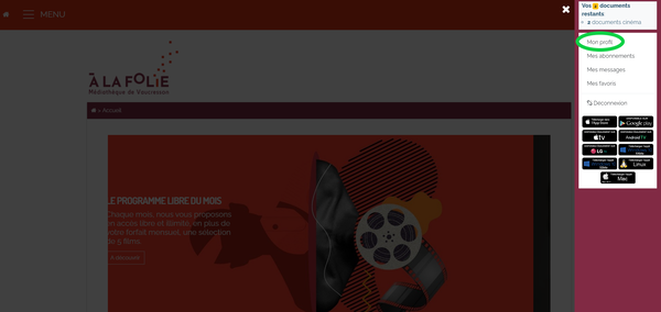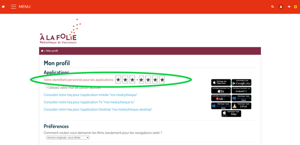 Cet identifiant est accessible sur votre compte de la médiathèque numérique. Connectez-vous et cliquez sur le logo « Mon compte » en haut à droite puis sur « Mon profil ».