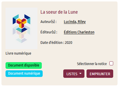 3. Parcourez le catalogue et sélectionnez le livre de votre choix avec la mention « Document numérique ». Cliquez sur EMPRUNTER.