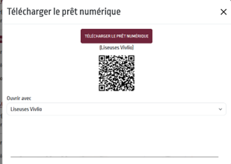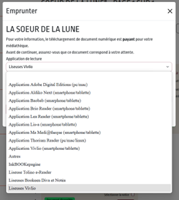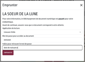 4. Choisissez Liseuse Vivlio comme appareil de lecture. Entrez ensuite votre année de naissance comme mot de passe, puis cliquez sur EMPRUNTER.